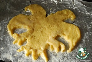 Другую раскатываем, вырезаем фигуру орла, можно по макету, я от руки делала. Аккуратно переносим на смазанный противень. -