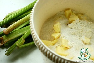 Ревень обрезать, очистить от тонкой кожицы, порезать на кусочки в 1-1,5 см.
