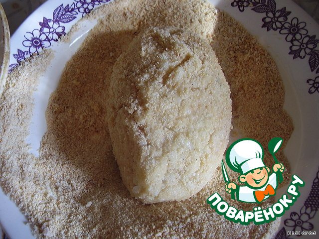 в отдельные тарелочки насыпать муку, панировочные сухари и яйца (взбить)