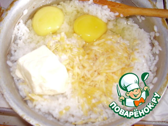 в горячий рис добавить сливочное масло, два яйца сырых,вторую половину твердого сыра, натертого на крупной терке, и хорошо перемешать