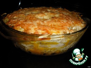 Последний штрих - отправляем в духовку на 1-1,5 часа при 180 градусах. Чтоб блюдо быстрее приготовилось, картошку предварительно сварить и добавлять вареную - это сэкономит время!