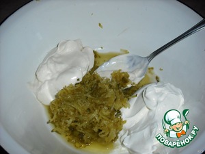 Делаем соус: огурец соленый трем на терку и добавляем пару ложек майонеза. Перемешать. Соус готов!