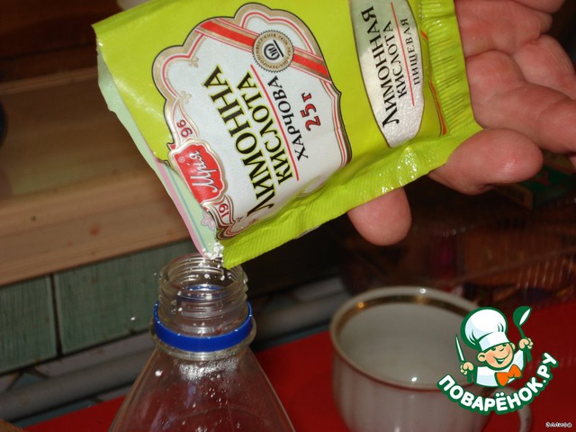 Шашлык нанизан и нам еще понадобится лимонная водичка, для сбрызгивания шашлыка. Для этого разбавляем воду с лимонной кислотой, переливаеем ее в пластиковую бутылку и в пробке проделываем дырочки.