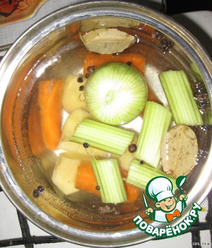 Заранее приготовим овощной бульон. В моём сегодня - сельдерей, картошка, морковка, лук.