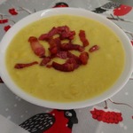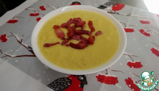 Остужаем немного, доводим до состояния пюре в блендере. Выливаем в кастрюлю, подогреваем, не доводя до кипения. Несколько ломтиков бекона или грудинки быстро обжариваем на сухой сковородке, режем кубиками, или целый ломник сворачиваем, выкладываем в тарелку с супом. Готово! Такое у нас сегодня было первое на обед:) Всем понравилось! Рекомендую и Вам! Приятного аппетита:)