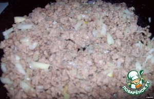 Фарш (у меня был свиной) посолить, поперчить, выложить на сковородку, протушить с мелко порезанным луком минут 10-15