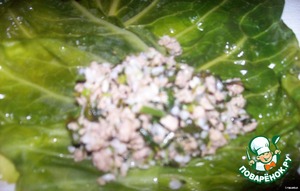 Капусту "раздеть". У меня были листы уже готовые, такими купила их на рынке (что и подсказало мне приготовить это блюдо :-)). Опустить в кипящий подсоленный кипяток, варить до мягкости. Кладём на лист фарш и заворачиваем в форме обычного голубца.