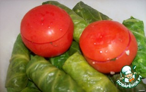 Уложить наши толмушки в кастрюлю. У меня не хватило листьев, я нафаршировала парочку помидорчиков. Залить кипятком, подсолить, положить 1-2 ст.л. томат.пасты. Варим до готовности.
