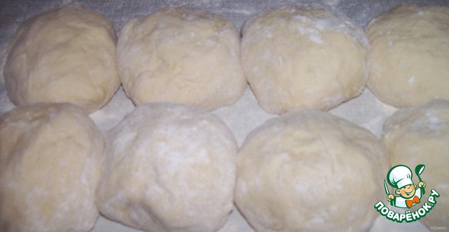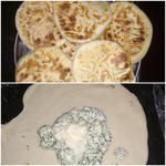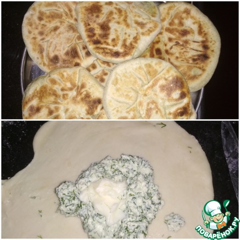 Берем наш шарик теста, раскатываем на присыпанной мукой поверхности, в круглый пласт, в серединку кладём начинку (брынзу ножом поделить на 8 равных частей, чтобы не "обидеть" лепешки :-) ) На брынзу кусочек масла, и защипываем края посередине.
