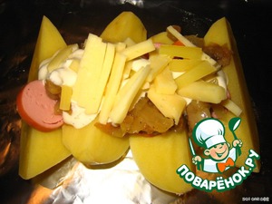 Чищенный картофель разрезаем на 4 части и укладываем на фольгу.