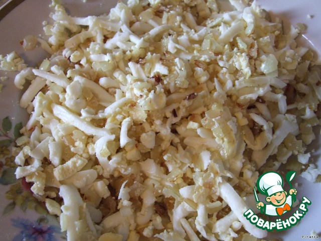 Сварить 3 яйца, почистить и потереть на крупной терке. 2 луковицы мелко порезать, пожарить до золотистого цвета на растительном масле, положить на бумажную салфетку и дать стечь лишнему маслу. Смешать яйца и лук.