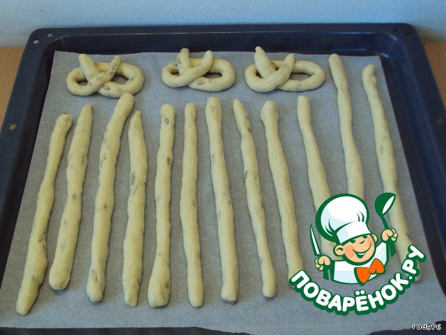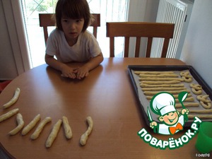 10 мин оставляем тесто отдохнуть и раскатываем палочки у меня получилось 24 палочки длинные. Помощница конечно же помогала.