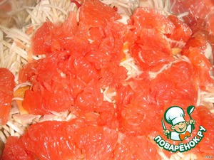 Грейпфрут очистить, разделить дольки на крупные кусочки, добавить в салат.