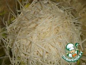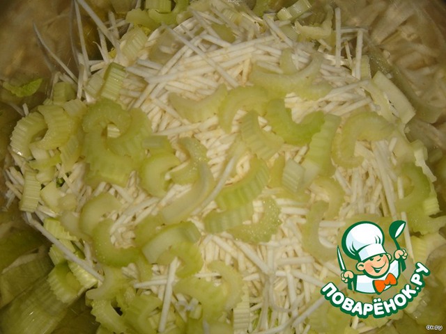 Корневой сельдерей очистить, порезать тонкой соломкой. Лучше на терке для корейских салатов. |