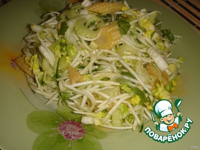 Очередной мой эксперимент, который лично мне очень понравился. Даже мой второй половин, который такие сочетания считает извращением, одобрил этот вариант. Легкий, сочный, весенний такой салатик....