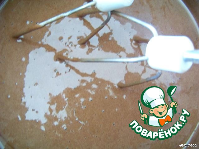 Во взбитые белки добавляем растертые желтки, какао, муку, соду (погасить!). -