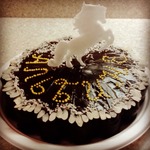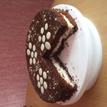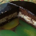 Разрезаем коржик пополам, пропитываем ликером, смешанным с водой (впитывается моментально, тесто очень нежное). Пропитываем как можно тщательнее, торт не должен быть сухим. Выкладываем начинку на половину коржа (я хотела еще взбить ее миксером, но вспомнила об этом только сейчас; все равно получилось очень вкусно). Сверху накрываем второй половинкой.