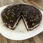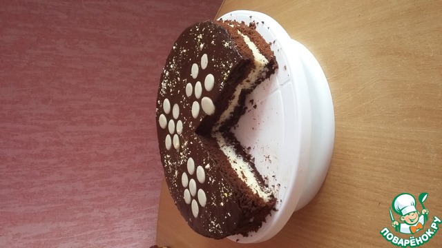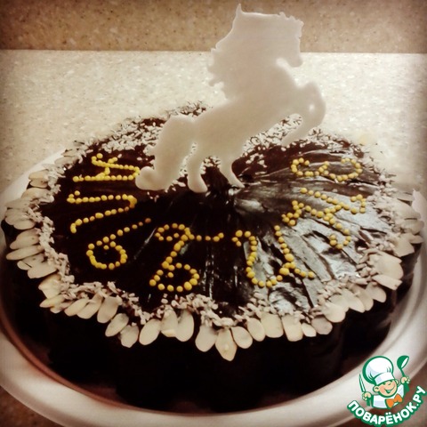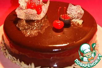 Глазурь делать не стала, торт был очень тяжелый-пропитка+начинки очень много получилось. Сверху посыпала шоколадной и миндальной крошкой