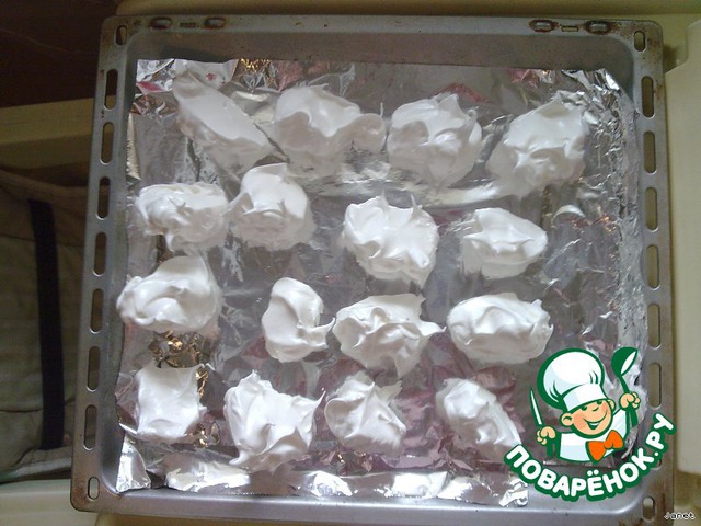 На противень положить кальку пищевую. Кальку ничем не смазывать, после выпекания безе легко отделяется от неё. И на кальку столовой ложкой выложить маленькие горочки белкового теста. Чем мельче, тем меньше времени потребуется для выпекания. Выпекаем 2-3 часа при 120 С.