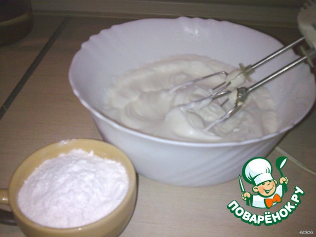 6 охлаждённых белков взбивать миксером до крепкой пены. Добавить постепенно 1 стак. сахарной пудры. Секрет в том, что бы все ингредиенты были охлаждёнными вместе с посудой и взбивание не прекращать.