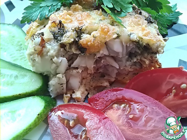 Смешать лук с морковью и мелко порезанную зелень, добавить всe в рыбу. Добавить в эту смесь майонез, сметану, потертый на терке сыр. Ещe раз перемешать и выложить в форму.