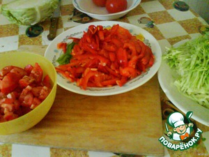 • Нашинковать капусту, перцы (у нас были 3 цветов - желтый, красный и зеленый), помидоры порезать кубиками