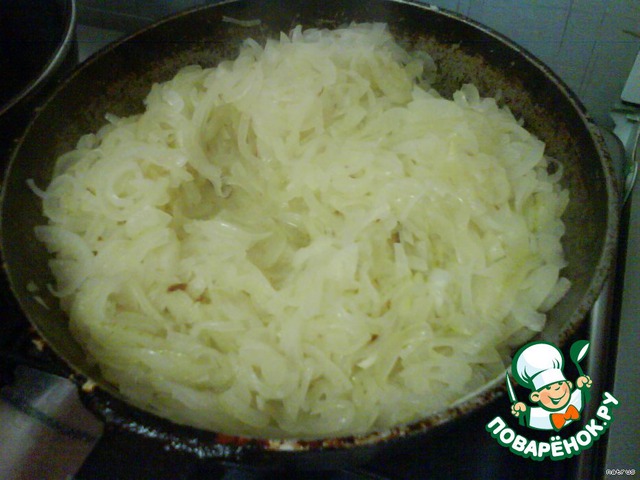 • Сварить мясной бульон (насыщенный) с пучком укропа для запаха (мы клали не резанный, потом вынули), мясо вынуть, нарезать мелкими кусочками. Несколько луковиц обжарить на сковороде до золотистого цвета