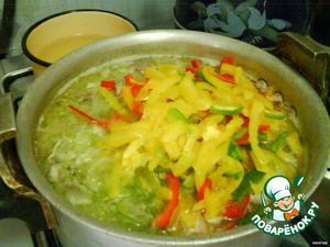 • Капусту положить в кипящий бульон, когда будет наполовину готова, добавить мясо