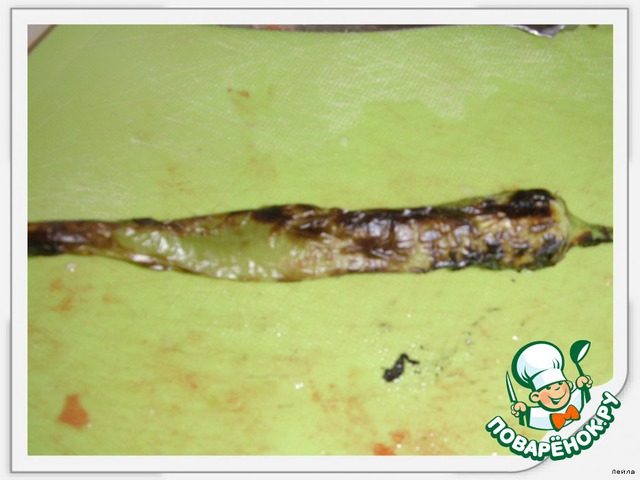 Отдельно в духовке или на газовой плите запечь острый перец,очистите от кожуры.