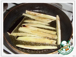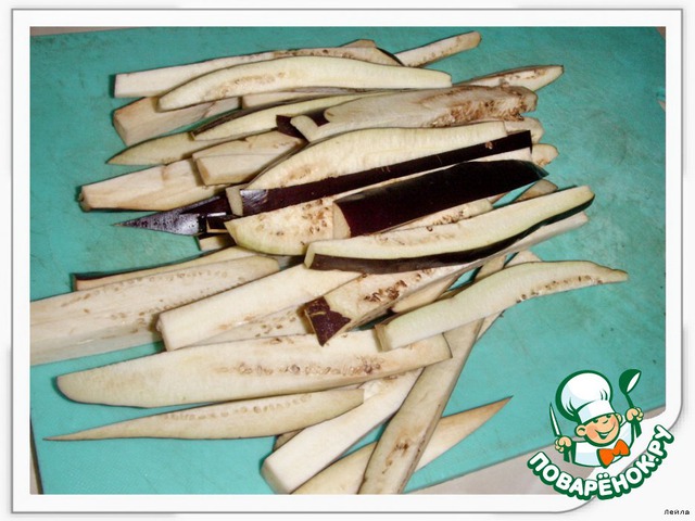 У баклажанов отрезать кончики. Каждый баклажан разрезать в длину и каждую половинку - на ломтики-брусочки. -