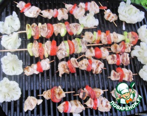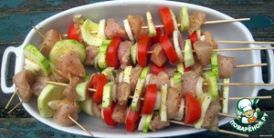 Затем нанизала маринованное мясо на шпажки, вперемешку с овощами.