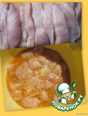 Я нарезала филе индейки и поставила его мариноваться в соусе из вышеперечисленных ингредиентов! В рецепте было указано, что не менее чем на 2 часа.