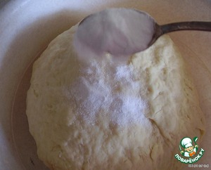 Когда тесто замесили, высыпаем на него соду и продолжаем месить.