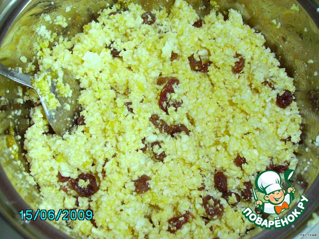 Делаем начинку: Предварительно замачиваем изюм, чтоб стал мягким. Смешиваем творог, сахар, яйца, изюм, ванилин.