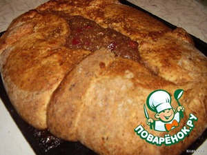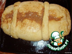 свернуть края к середине, переложить пирог в форму, смазанную растительным маслом, срезанные полоски теста положить поперек и слегка придавить, поставить в разогретую духовку и выпекать 50-60 минут при температуре 200 градусов