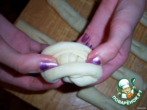 Каждую смазываем растительным маслом (без запаха),посыпаем сахаром и сворачиваем в рулетики.Посередине делаем разрез.