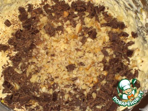 Добавить в тесто орехи и шоколад и размешать. Чтобы все распределилось равномерно.