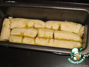 Бананы очистить и разрезать вдоль. Уложить в форму так, чтобы всё дно было закрыто. Можно в два ряда уложить, будет более банановей, особенно любители печеных бананов оценят))))