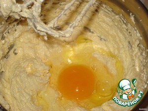 Для теста размягченный маргарин взбить с 125 г сахара в легкий белый крем (5 минут), добавить яйцо и хорошенько его вбить в массу миксером.