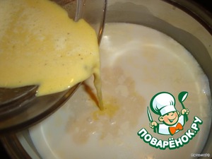 Пока молоко нагревается, взбиваем в миксере яйца со сметаной, добавляем карри, соль и черный перец. Затем выливаем смесь тонкой струйкой в молоко, перемешиваем и оставляем нагреваться на среднем огне, примерно, 20-25 минут.