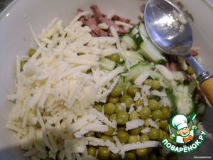 Нарезать соломкой язык,огурец,помидор,сыр.Добавить зел.горошек. Соединить аджику с майонезом и заправить салат.Приятного аппетита!