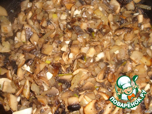 • Теме временем сделать начинку для кручеников, обжарив мелко порубленный лук с шампиньонами, приправить солью, перцем по вкусу, выдавить чеснок.