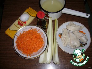 Вам понадобятся: отварные куриные грудки, варенное яйцо, соевый соус, 2-3 корня сельдерея, нашинкованная морковь, японская лапша и куриный бульон (из под грудок)