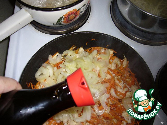 когда морковка обжарится, добавить сельдерей, влить соевый соус и куриный бульон, накрыть крышкой и тушить, пока сельдерей не станет мягким
