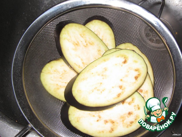 Баклажаны кладём в дуршлаг, посыпаем солью и оставляем на 10-15 мин., чтобы ушла горечь. Промываем под струей воды и хорошенечко просушиваем бумажным полотенцем.