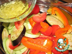 Чеснок очистить, измельчить и смешать с оливковым маслом (если есть настоянное на чесноке - еще лучше). Овощи сложить в большую миску, влить чесночное масло и перемешать.