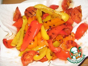 Положить на сковороду помидоры и перцы, жарить по 1,5 мин. с каждой стороны.
