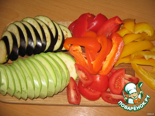 Овощи вымыть. Баклажан и кабачок нарезать по диагонали кружками толщиной примерно 1 см. Помидоры и перцы разрезать вдоль на 4-6 частей. Из перцев удалить сердцевину.