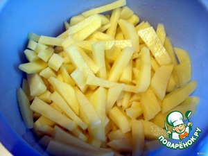 Картошку режем на брусочки и кладем в кипящую подсоленную воду.
