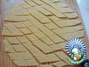 Пока варится картошка, раскатываем тонко тесто (но не так тонко,как на лапшу)и режем ромбиками.